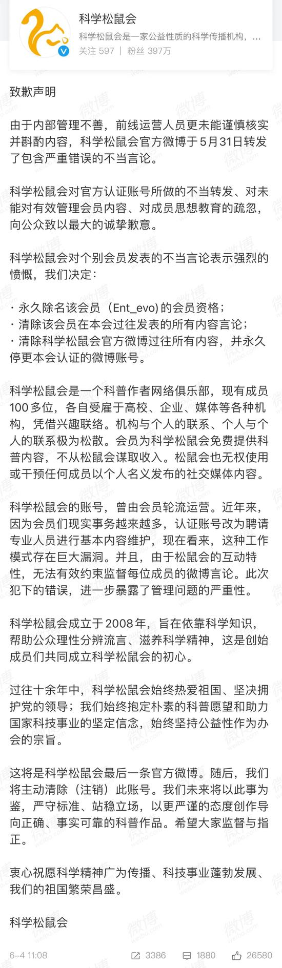 @科学松鼠会 则将责任归咎于内部管理不善,将清除官博过往所有内容,并永久停更该账号;同时,它还对会员@Ent_evo 发表的不当言论表示强烈愤慨,对其做出除名处罚。