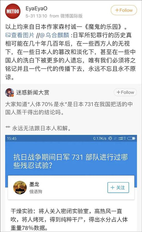 结合它含糊其辞的道歉声明,更有人感觉@科学松鼠会 此举多少有些在发泄怨气的意思,认为它与其清除往期博文关闭账号,不如尽到科普博主的义务,好好地给公众制作一期关于日军731部队罪行的科普内容。