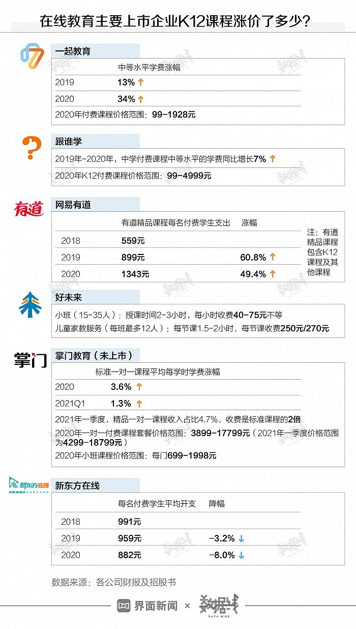 家长们报班很疯狂,费用也越来越高。目前,各公司K12付费课程定价从几百元到几千元不等,部分课程价格达上万元。以市值最高的好未来为例,其小班教育每小时收费在40元到75元不等,按一节课2小时计算,每节课最高收费150元。儿童家教服务更贵,每节课收费在250元至270元。掌门教育还推出了一对一付费课程“套餐价”,2021年一季度该价格为4299元至18799元。财报显示,掌门教育每6个月会提高一对一课程的标准学费,一起教育每6到12个月会提高一次学费。2020年,6家公司中有4家学费上涨,其中一起教育学费涨幅最高,2020年中等水平学费上涨34%。2020年网易有道精品课程付费学生人均支出达1343元,同比增长近5成。