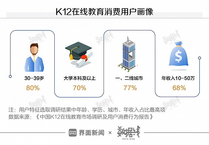 据《中国K12在线教育市场调研及用户消费行为报告》,30岁至49岁的人群是给孩子报线上学习班的主力军,占比80%。70%的家长有本科及以上学历。目前,在线教育的消费人群7成以上集中在一二线城市,近7成家庭年收入在10万元到50万元之间。