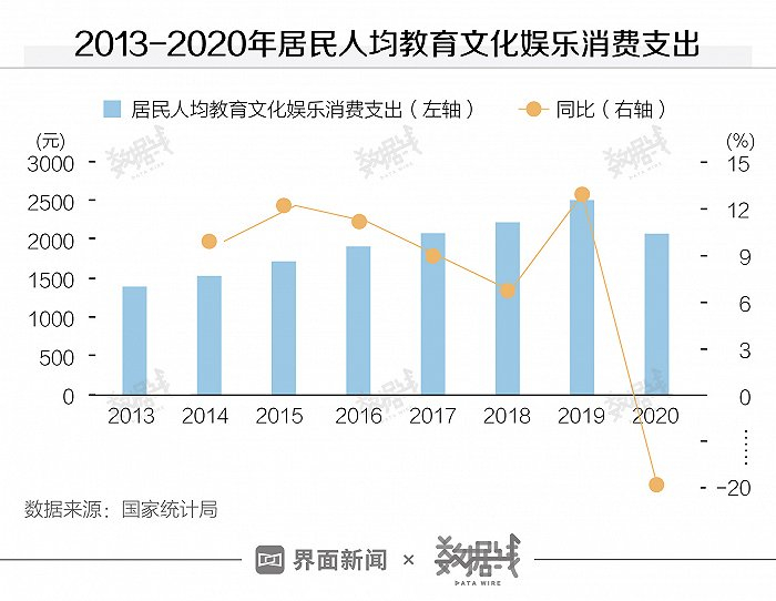 据国家统计局数据,2013年至2020年,全国居民人均教育文化娱乐消费支出从1398元增长至2032元,8年上涨45.4%。据界面数据统计,剔除2020年疫情影响,2013年至2019年涨幅接近80%。