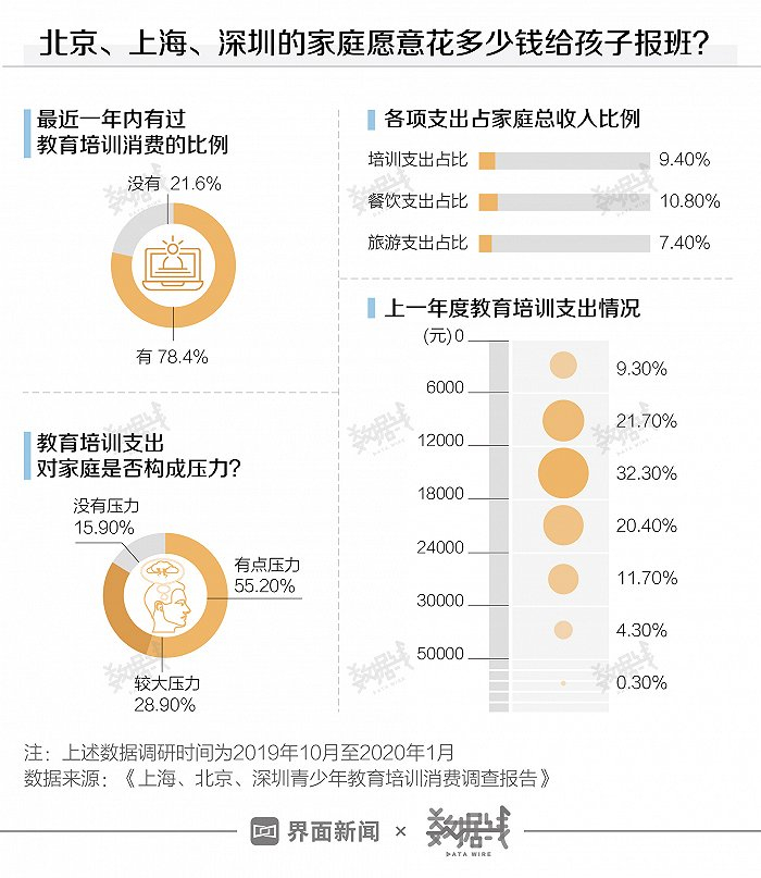 一线城市家庭中,每年花1万元给孩子报班已经是普遍现象。上海市消保委2020年3月发布的《上海、北京、深圳青少年教育培训消费调查报告》显示,北京、上海、深圳共有78.4%的家庭在最近一年中有过教育培训消费。孩子教育培训的平均年支出约为1.6万元(不含学历教育),占家庭总收入的9.4%,超过旅游支出占比,接近餐饮支出占比。8成以上的家庭都表示给孩子报班有一定经济压力。