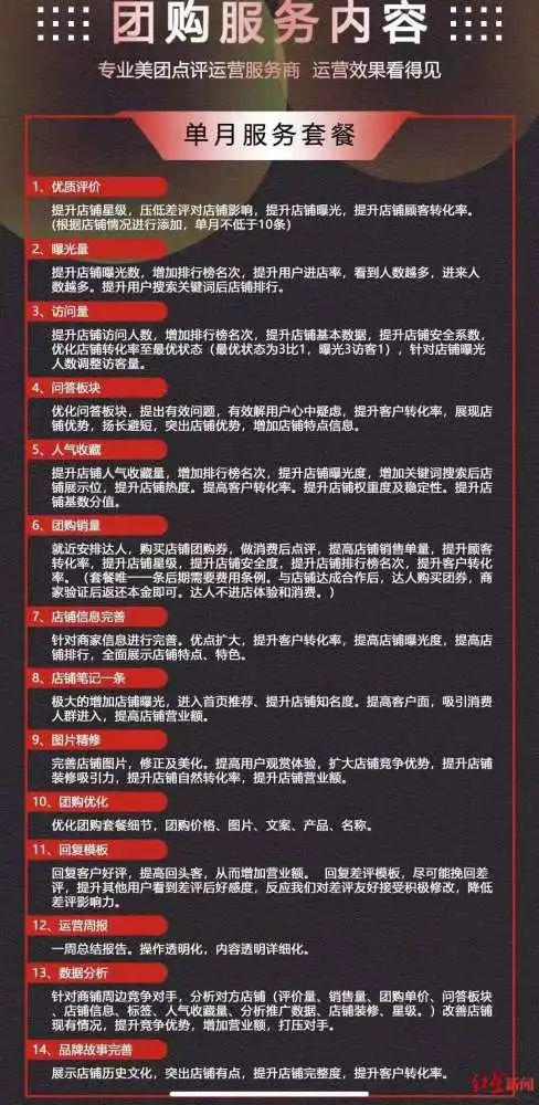 在月度服务套餐中共包含14个项目,包括优质评价、曝光量、问答板块、人气收藏、团购销量等等,甚至还提供运营周报和数据分析,十分完善。