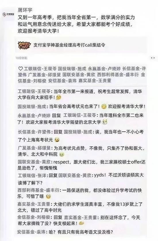 其中,署名为工银瑞信王筱苓评论表示自己也毕业于清华大学,是当年的市一级高考状元;国投瑞银施成也表示“当年省会高考状元也来了,欢迎报考清华大学”。