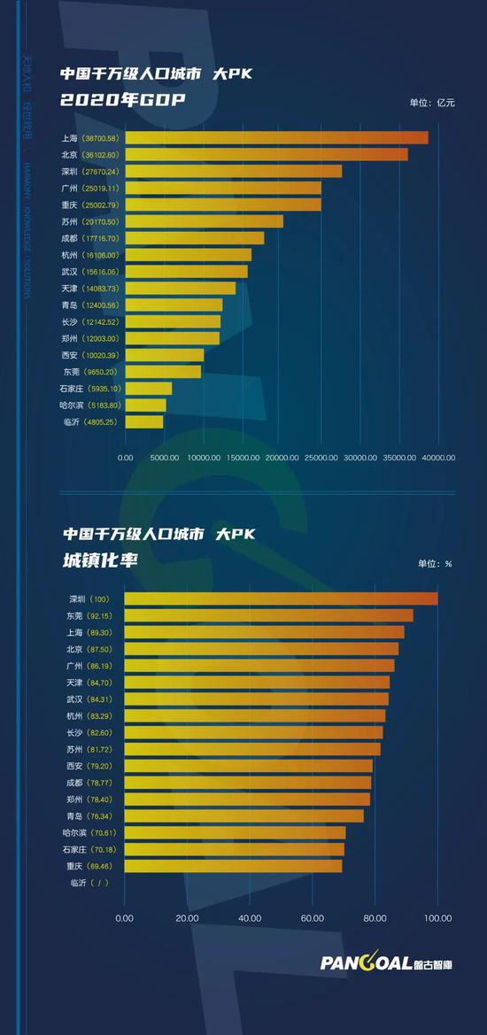 根据2020年的GDP情况来看,除东莞、石家庄、哈尔滨、临沂四市以外,所有城市的GDP均超过1万亿,其中,上海、北京、深圳、广州、重庆、苏州超过2万亿。