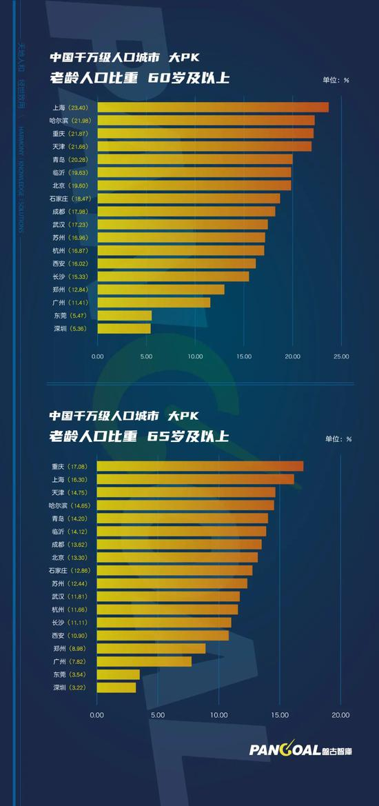从已公布的数据看,“千万人口俱乐部”中除了深圳、东莞因为建市沿革和新兴产业高度集中更吸引青年人才以外,其他16城均已进入人口老龄化社会。上海、重庆、天津、青岛、哈尔滨和临沂六市已经达到中度人口老龄化社会的国际标准线(60岁及以上年龄人口占比超20%或65岁及以上年龄人口占比超14%),北京也在迈进中度老龄化“门槛”上。相比之下,重庆、上海、天津的高龄老人占比更多。虽然都处在中度老龄社会,但这6个城市经济发展规模、阶段和产业结构差异明显,老龄化带来的挑战不尽相同值得深度考量。
