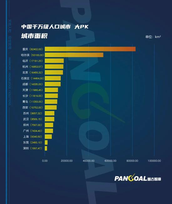 从城市面积来看,重庆与哈尔滨超过5万平方千米,并分居第一第二名。同时,城市面积未超过1万平方千米的城市有7个,分别为苏州、武汉、郑州、广州、上海、东莞、深圳。