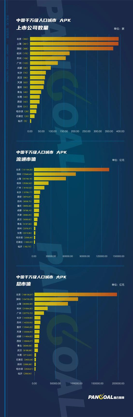 截至2021年6月4日,以上18个人口超过千万级的城市中,共有3个城市的上市公司数量超过300家,分别为北京(392家)、上海(391家)、深圳(368家);上市公司数量超过100家的城市分别为杭州(175家)、苏州(158家)、广州(123家)。