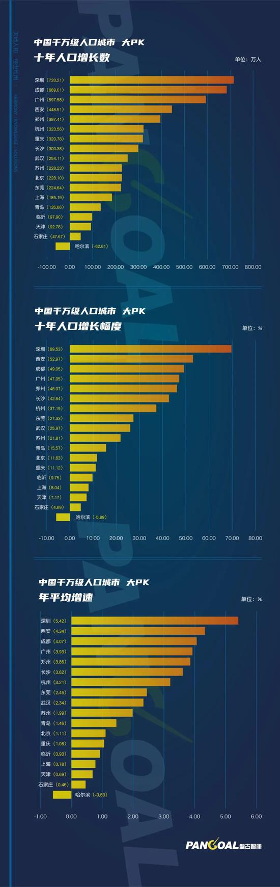 从人口增长幅度来看,深圳、西安、成都、广州、郑州、长沙六市增幅超过40%;临沂、上海、天津、石家庄四市人口增长放缓(但未出现负增长)且增幅小于10%。