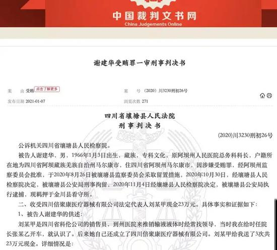 判决材料显示:谢建华在2015年初跟随院长“谷某某”一起到成都出差,在一家名叫“一品天下”的酒楼见到了刘某。刘某给了谢建华一个塑料袋,感谢生意上的关照,塑料袋里是8万元现金。