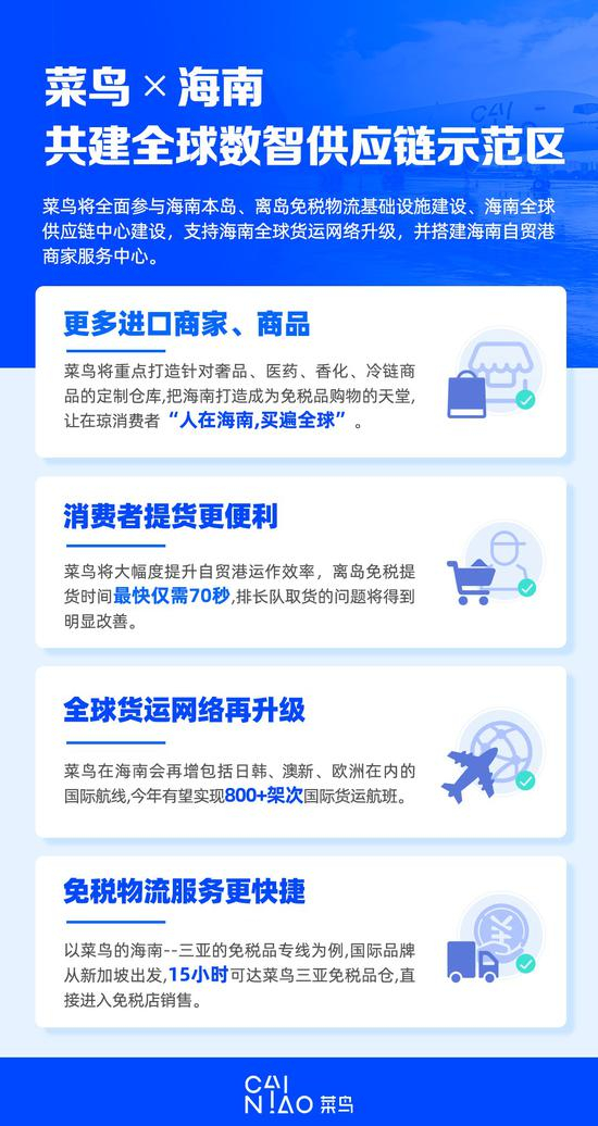 此次合作具体包括四个方面,菜鸟将全面参与海南本岛、离岛免税物流基础设施建设、海南全球供应链中心建设,支持海南全球货运网络升级,并搭建海南自贸港商家服务中心。