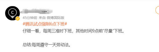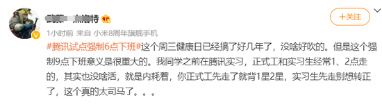还有网友表示,这个周三健康日已经搞了好几年了,没啥好吹的。但是这个强制9点下班意义是很重大的。同学之前在腾讯实习,正式工和实习生经常1、2点走的,其实也没啥活,就是内耗着,你正式工先走了就背1星2星,实习生先走别想转正了。