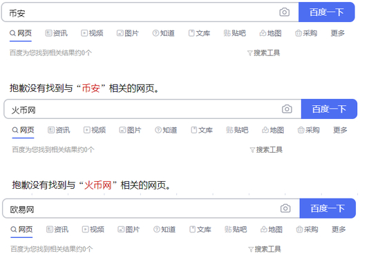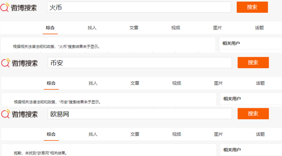 当天,在微博和百度上,输入“火币”“币安”“欧易”等关键词时,弹出的是“搜索结果未予显示”等提示。截至券商中国记者发稿,上述关键词仍被百度、微博屏蔽。