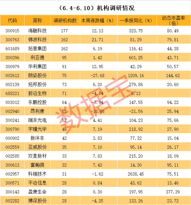 近一周机构调研个股数量有160多只,海融科技成为调研机构数量最多的股票。