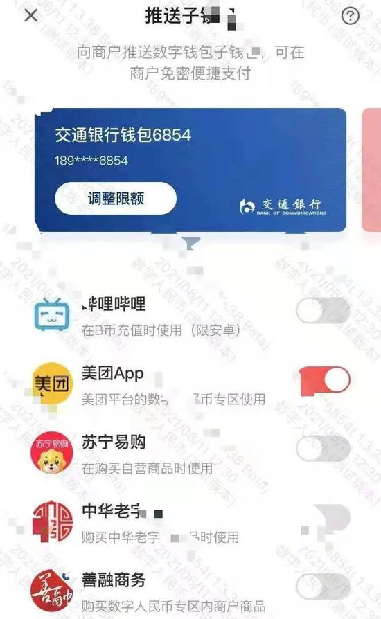 叶先生通过交通银行中签,在他手机上可以看到,其可推送子钱包覆盖商户(即向这些商户推送数字人民币子钱包,就可以在这些商户免密便捷支付)中,有美团APP、滴滴出行、真快乐(国美线上商城)、东方航空、携程、天府通(成都公交地铁乘车APP)、哔哩哔哩苏宁易购、中华老字号、善融商务(建行主推的线上商城)等APP。