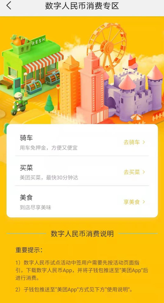 在美团APP开放了单车、买菜、餐饮等三大老百姓日常生活中的高频业务场景,支持数字人民币消费。对比过往历次试点,这应该是国内首个聚焦线下场景的线上数字人民币消费专区。