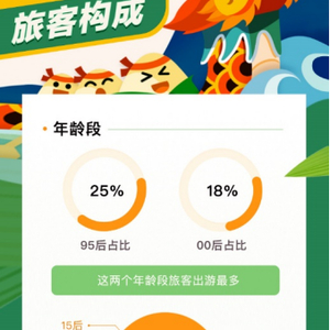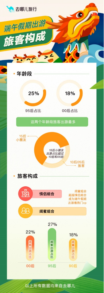 去哪儿数据指出,闺蜜超越情侣成为端午假期出游的最热门组合。出游的“95后”中,近三成和闺蜜一起出游;由于期末考试临近,“10后”游客出游减少;而无需面对考试的“15后”则多和父母一起出游。