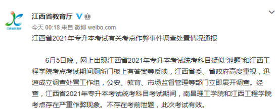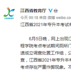 据江西省教育厅微博消息,6月14日,江西省2021年专升本考试有关考点作弊事件调查处置情况通报发布。