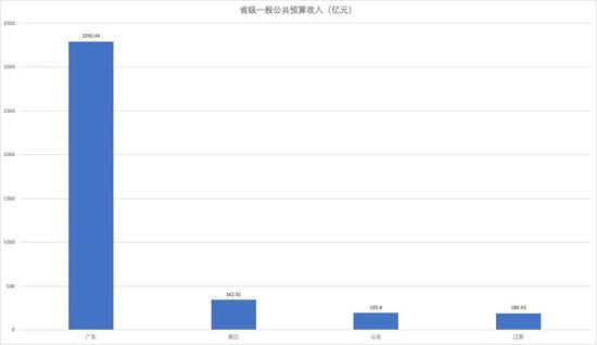 2019年,广东的省级一般公共预算收入为3290.44亿元,而浙江为342.92亿元,山东193.4亿元,江苏189.93亿元。广东是浙江等地的九倍以上。