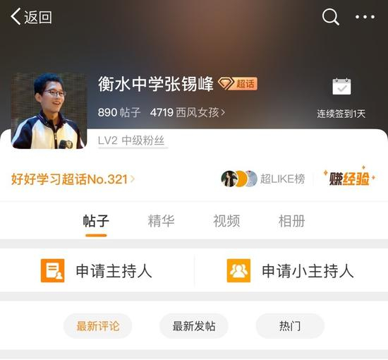 在某平台,张锡峰已拥有了自己的超话,而且“衡水中学张锡峰”超话里则聚集了4719个“西风女孩”。“西风女孩”为“锡峰女孩”的谐音,也是张锡峰粉丝的自称。