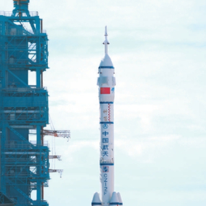 晨光下,发射塔架由上至下徐徐打开回转平台,长征二号F火箭托举着神舟十二号飞船离开塔架的怀抱。火箭露出了全部面容,乳白色的长征火箭耸立在蓝天与荒漠之间,直指苍穹。火箭箭体上鲜红的五星红旗和“中国航天CZ-2F”字样格外醒目。