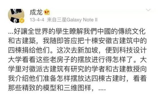 此外,成龙剁手了不少古宅。从上世纪80年代开始,成龙一共收藏了7间屋龄超过500年的徽派古屋、2间亭楼,都在苏州。不过目前,成龙捐了4栋给新加坡,其余都捐给了内地。
