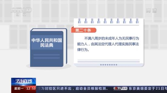 《中华人民共和国民法典》第二十条 不满八周岁的未成年人为无民事行为能力人,由其法定代理人代理实施民事法律行为。