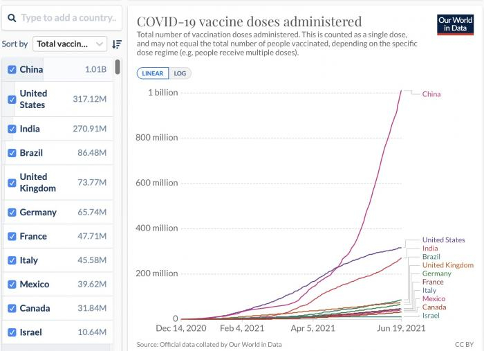 英国牛津大学团队创立的数据网站“Our World in Data”提供的数据显示,美国与印度的接种数量也已破亿,而我国的接种数量甚至超过了这份榜单上排名2至10位国家的接种总和。