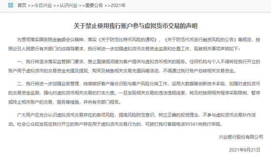 在被央行约谈之后,6月21日晚间,工商银行、农业银行、建设银行、邮储银行、兴业银行纷纷发布声明称,禁止使用公司服务开展比特币等虚拟货币交易。一经发现将立即采取暂停相关账户交易、终止金融服务等措施。