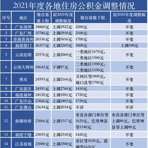 深圳和广州的上调幅度排在青海黄南州之后,住房公积金缴存基数上限分别上调2922元和2910元,达到34860元和33786元。