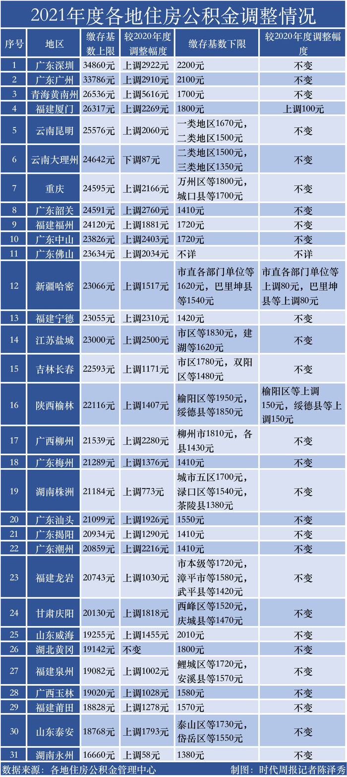 据时代周报记者不完全统计,截至6月22日,全国已经有广州、深圳、重庆、福州、厦门、昆明、佛山、中山等31个城市发布2021年度住房公积金缴存基数调整方案。