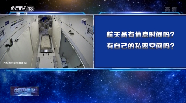 中国载人航天工程航天员系统总设计师黄伟芬:我们是允许的,在他休闲的时间里,有自己的私密的空间。每天他都有一个时间,比如睡前一个小时就是属于他个人的时间,他愿意休闲做一些什么事情,听听音乐,看看书,这都是他的自由。每周有一天是属于他休整的时间,他自己来支配。
