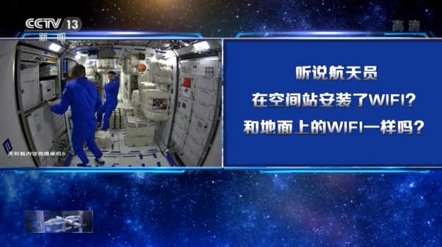 北京航天飞控中心空间站任务总师 孙军:我们天上的网和我们地面的网是连成一体的,有了WIFI之后,航天员就可以和地面的人员,甚至是他们的家人进行沟通,可以进行顺畅的沟通和视频通话。