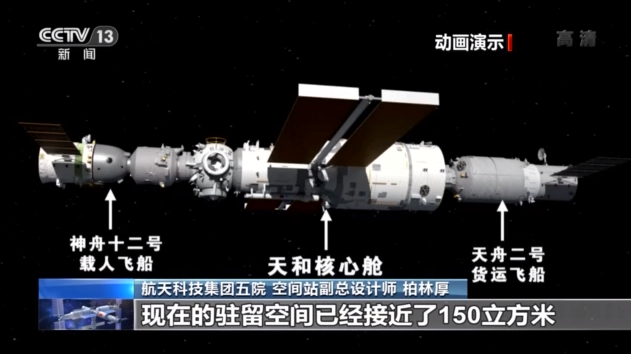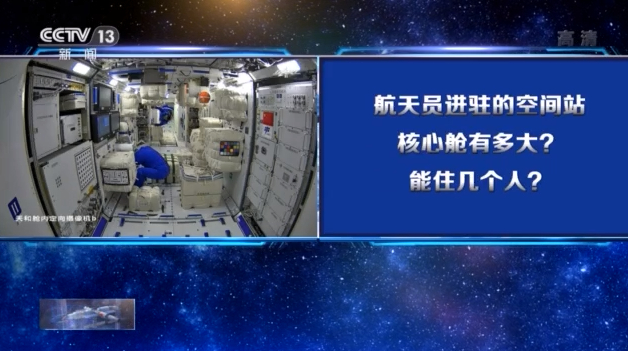 航天科技集团五院空间站系统副总设计师柏林厚:核心舱能提供给航天员的活动空间超过50个立方米。再加上来访的载人飞船和货运飞船提供的空间,现在的空间已经接近了150立方米,相当于有将近10倍的增长。如果说原来的航天员是生活在一个标间里,那么以后的航天员就生活在一个别墅里。