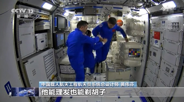 中国载人航天工程航天员系统总设计师黄伟芬:不可能像咱们在地面这样来洗淋浴,那是不可能的。我们会给他们准备一些湿毛巾,他们可以把湿毛巾加热,加热了以后擦拭。洗头我们准备了浴帽,把浴帽套在头上,免洗的洗发液挤出来以后,揉搓洗,洗完了之后擦干净。还能理发,也能剃胡子,还是挺全能的。