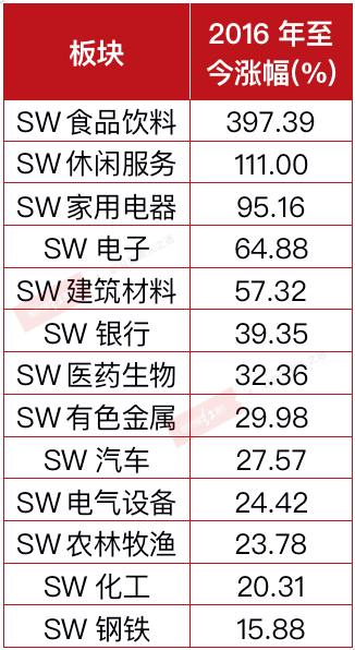 统计数据显示,2016年至今,申万28个大类行业有13个实现上涨,其中,表现最好的是来自消费领域的食品饮料、休闲服务、家用电器,涨幅分别达到397.39%、111%和95.16%。此外,拥有科技属性的电子板块累计上涨了64.88%,医药生物板块也累计上涨了32.36%。