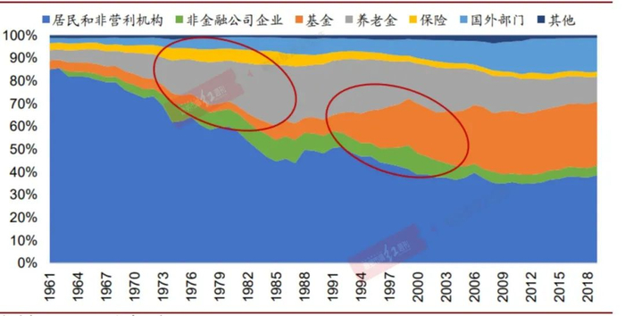 还是先以美股市场进行分析,可以看到自20世纪70年代以来,美国股票市场的投资者结构发生了重大变化,个人投资者持股比例持续下滑,机构投资者持股比例稳步上升,特别是养老金和公募的崛起,让美股居民和非营利机构的持股比例在20世纪70年代和本世纪初两个阶段出现了快速下滑。具体来看,60年代初期居民和非营利机构在美股的持股占比为85%,从70年代开始随着养老金入市,个人占比加速下滑,截至1985年最低下降至45%。之后虽有小幅回升,但从90年代开始又重回下降通道,最低在2008年降至35%,之后基本保持在35%~40%区间内。