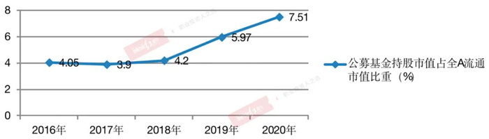 在A股市场机构化程度持续提升的背后,公募基金的快速发展显然是功不可没的。自1998年成立了第一批封闭式基金、2001年成立第一只开放式基金以来,公募基金规模一直持续扩大中。若对2016年至今历年年末公募基金持股在市场中占比进行统计,可发现除了2017年出现过下滑外,公募基金持股占A股流通市值的比重一直在持续提升中,尤其是2019年和2020年,在大量居民资金通过基金入市的热潮下,公募基金规模出现了爆发式增长。据中国基金业协会最新数据显示,截至今年5月底,最新公募基金产品数量为8061只,公募规模为22.91万亿元,较4月底增长4000亿元,环比增长1.79%,与去年同期相比增长29.84%。