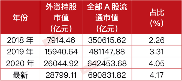 统计2018~2020年末外资持有A股的情况,2018年末时,外资合计持股市值还仅为7914.46亿元,而到了2020年末,则已升至26044.92亿元。今年以来,虽然春节后市场出现了一波较大幅度的回撤,但外资合计持有A股的市值依然在继续扩张,若以6月23日的股价统计,外资合计持股市值已升至28799.11亿元,持股市值占全A流通市值的比重也由2008年末的2.26%升至目前的4.17%。