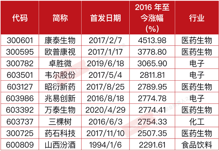 个股表现上,有119家公司自2016年以来斩获了5倍以上的涨幅,涨幅超过10倍的也有40家。就这119家股价涨幅超过5倍的公司的行业属性来看,医药生物、电子和食品饮料三大板块可谓是牛股集中营,其中,属于医药生物类的公司有26家,属于电子类的公司有19家,而属于食品饮料板块的公司也有13家。若以涨幅排序,排在前10位的大牛股中,有9只是来自于医药生物、电子、食品饮料三大行业,仅有三棵树一家公司隶属于化工化学制品板块。