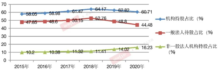 Wind数据显示,在机构持股中,产业资本为主的一般法人持股(大股东及其关联方)在股改完成后,一直是持股规模最高的投资者。以2015年以来情况看,在2015年至2018年期间,一般法人持股占全部A股流通市值的比重在持续上升中,最高时曾达到53%左右,而到了2019年之后,这一占比情况出现了持续下滑,最新占比已不足45%。相对的,在剔除一般法人持股后,可以发现公私募基金、券商、社保基金、QFII、保险等机构的合计持股占比自2015年以来一直在持续抬升中,2016年末的持股市值占总流通市值比还只有10.2%,等到了2020年末,已上升至16.23%。另据中国证券投资基金业协会公布的数据,国内资产管理业务总体量已从2015年的37.31万亿元上升至2020年的58.99万亿元,这一上涨幅度充分显示机构队伍的壮大。