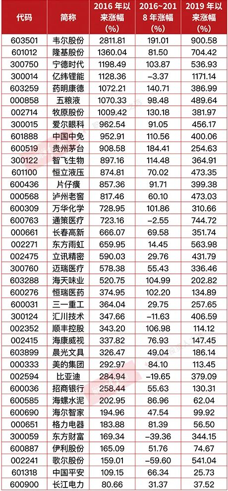 在资金扎堆蓝筹的同时,可以看到蓝筹股的估值自2016年开始逐步得到溢价,特别是2019年以来,代表市场核心蓝筹的沪深300标的估值加速增长。譬如韦尔股份,2016年至今公司股价累计涨幅为2811.81%,其中2016~2018年累计上涨了191.01%,而2019年至今则累计上涨了900.58%;隆基股份2016年至今累计上涨1360.04%,2016~2018和2019年至今的阶段涨幅分别为81.5%和704.42%。