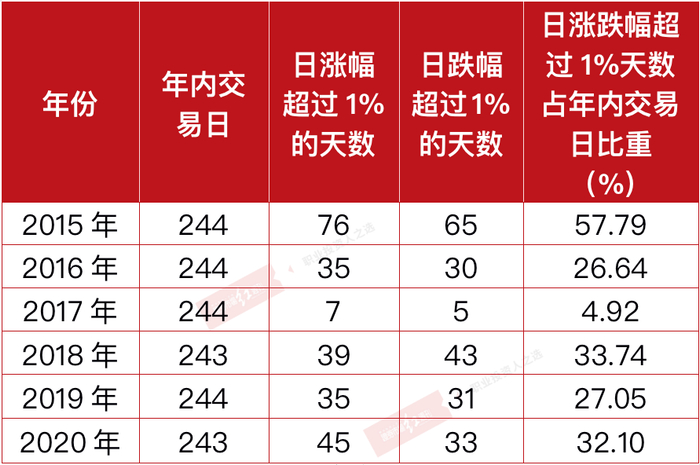 表1 2015年~2020年每年指数日涨跌幅超过1%情况