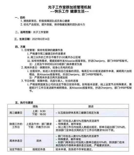 6月14日,腾讯旗下的光子工作室群实行新的加班管理机制:除了“周三健康日”晚6点下班,其余工作日的下班时间不得超过晚上9点;全面双休,严禁周末两天连续加班;如有特殊需求,需提前发邮件报备,经由领导审批。