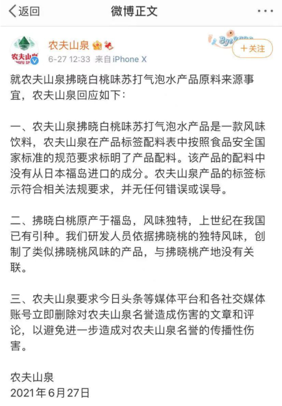 6月27日消息,#农夫山泉否认涉日本福岛进口成分#登上微博热搜。今日有媒体曝出农夫山泉旗下一款气泡水产品,在外包装与商场宣传中主打“福岛县产”的招牌。对此,农夫山泉官方微博今日午间发布相关回应,否认涉日本福岛进口成分。