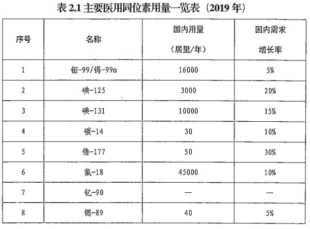 《规划》还提到,以核医学领域常用的8种医用同位素为例,预计每年需求量将以5%~30%的速度增长,预计到2030年需求总量将增加10倍以上。其中,氟-18的国内用量最高,为4.5万居里/年。