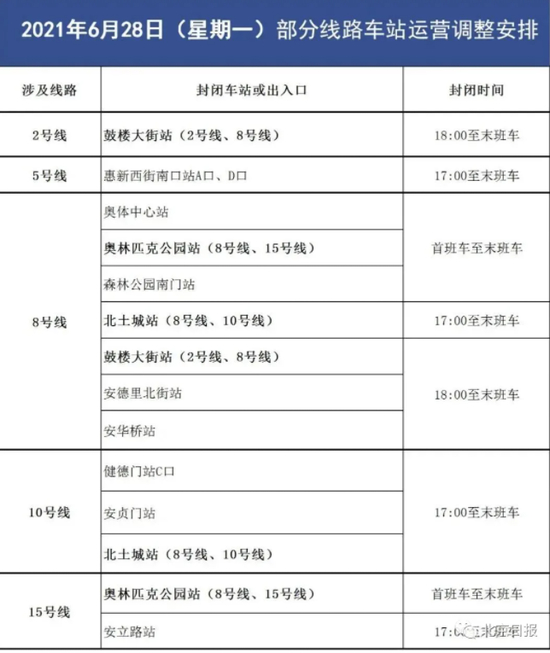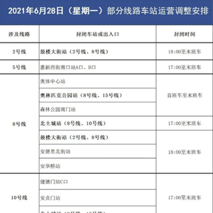 2021年6月28日(星期一),部分地铁线路车站将进行如下运营调整。