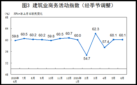 业务活动预期指数为60.8%,比上月回落2.1个百分点,仍位于高位景气区间,表明非制造业企业对行业发展继续看好。分行业看,建筑业业务活动预期指数为63.2%,比上月回落2.5个百分点;服务业业务活动预期指数为60.4%,比上月回落2.0个百分点。