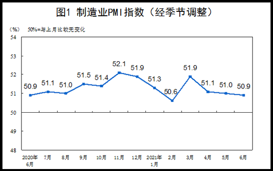 6月份,中国制造业采购经理指数(PMI)为50.9%,较上月微落0.1个百分点,继续位于临界点以上,制造业延续稳定扩张态势。