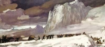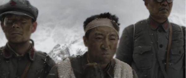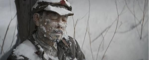 当时,指挥员把马让给重伤号,边走边检视前后的队伍,突然发现路边有一个因冻饿而亡的老兵。老兵倚靠一棵枯树坐着,身上落满了雪,半截纸卷的旱烟还夹在右手的中指和食指之间,烟火早被风雪打灭。他微微前倾着身子,似在向战友借火,单薄破旧的衣服紧紧地贴在他的身上。